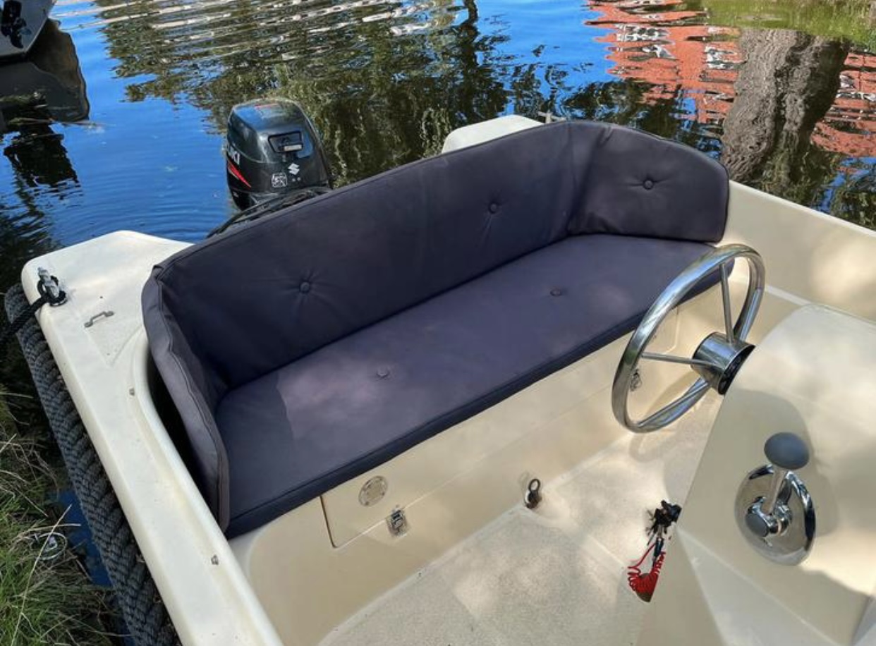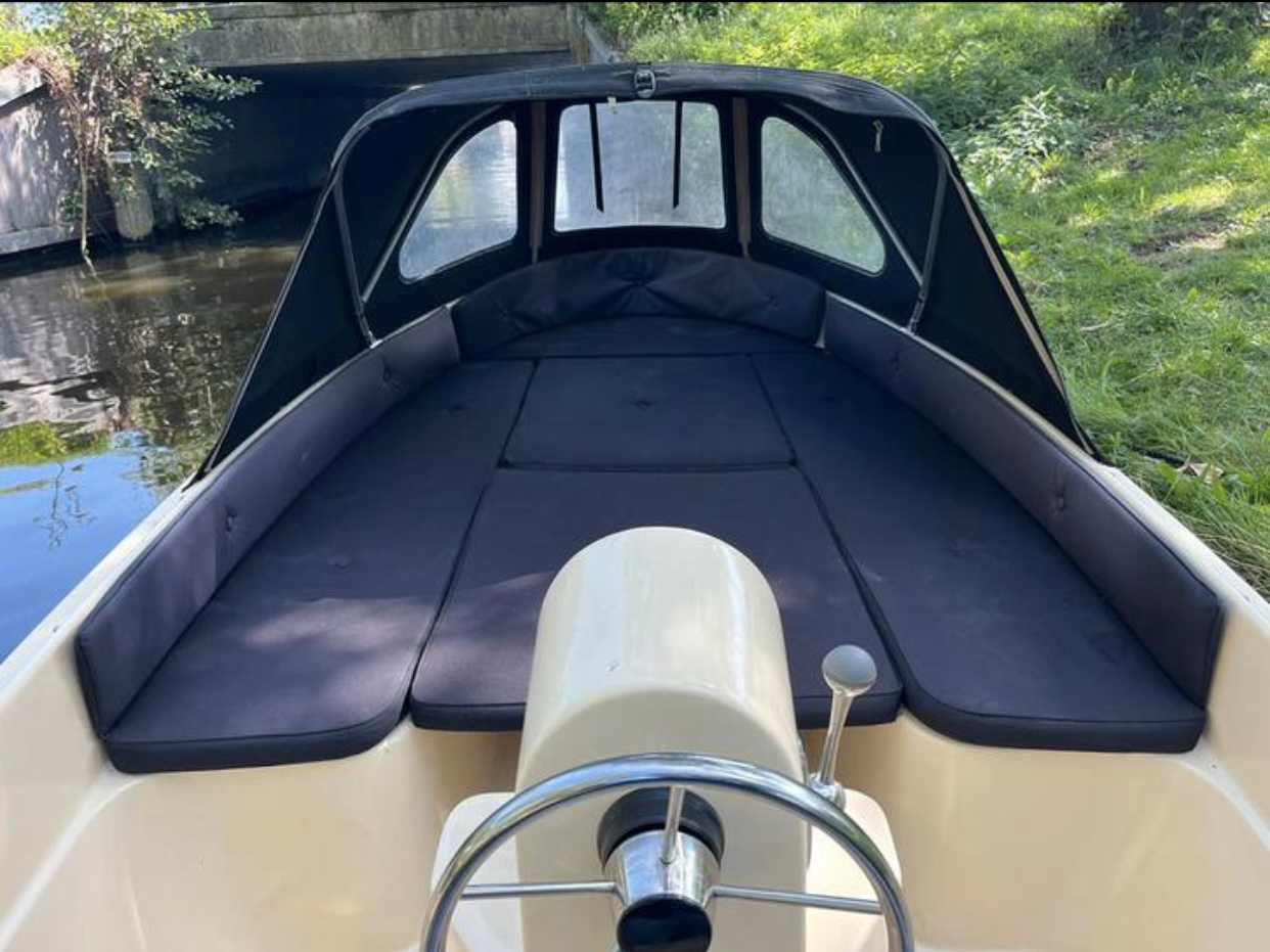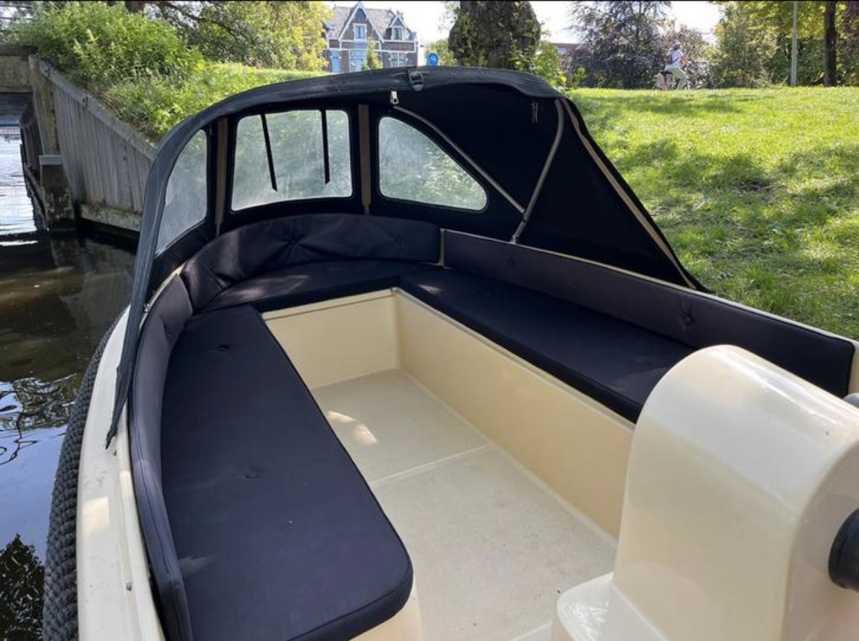 Onze sloep is voorzien van kussens, een buiskap en voldoende bergruimte onder de banken.